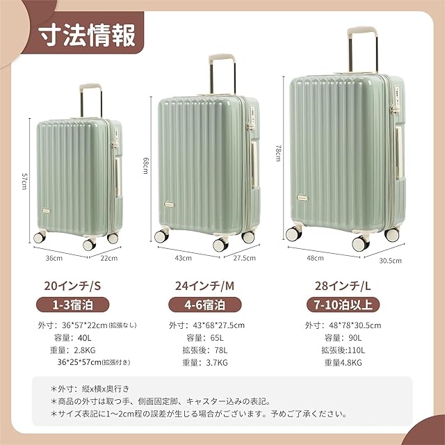 【機内持ち込みサイズ】:57×36×22三辺合計115cm。サイズは外寸(高さはキャスターを含む地面からの高さです。)機内持ち込み可能 キャリーケース。容量:40L、宿泊目安:1~3泊。シンプルで大きいスーツケースが欲しい人向け。