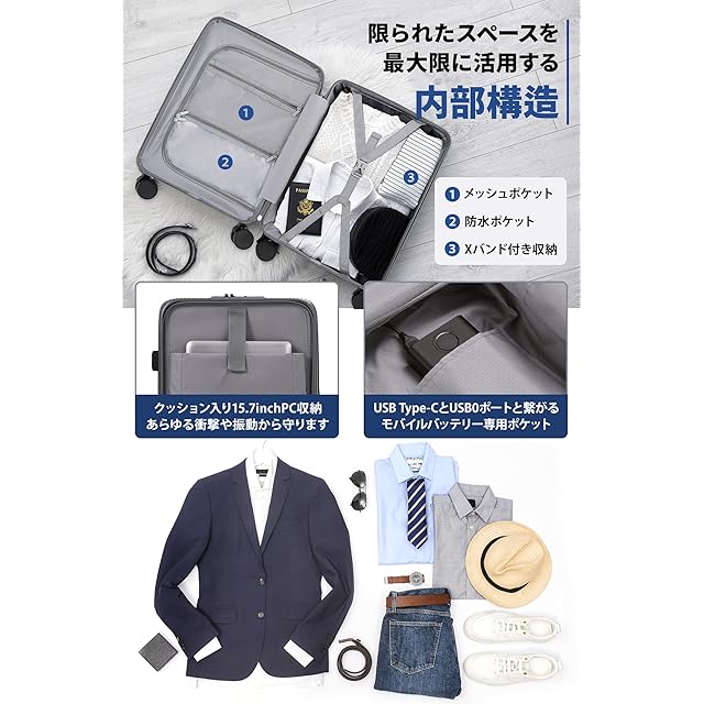 【スーツケース 機内持ち込み・フロントオープンデザイン】フロントオープンのデザインで。タブレット、書籍、携帯電話、チケットなど、荷物に合わせた細かなポケットを用意しており、フロントポケット内の荷物の仕分けもラクラク。また,出張や資料の持ち運びなどビジネス用途から旅行まで、色々な場面で活躍できます。人気が高い前開きのキャリーケースです。