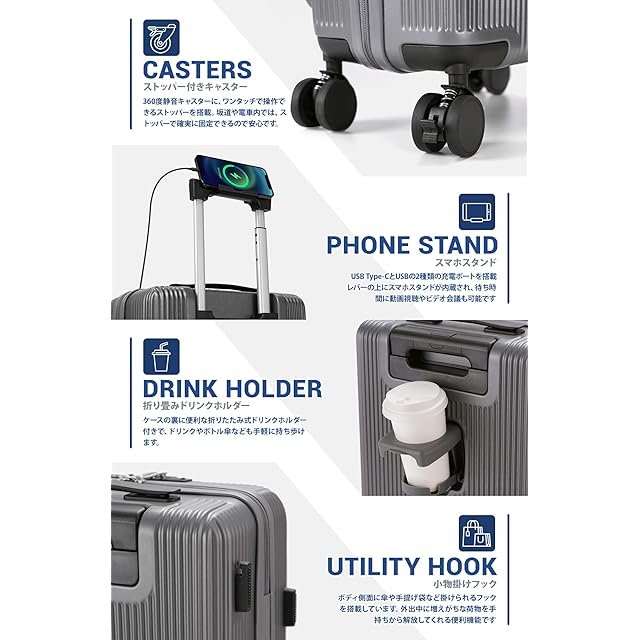 【スーツケース 機内持ち込み・折りたたみカップホルダー&フック機能付き】折りたたみ式カップホルダー付き :便利な折りたたみ式ドリンクホルダー付き。ミルクティーカップ、傘いつでも配置でき、旅行をより便利にすることができます。さらに、隠れたフックが付き、旅行中の手への負担を軽減します。