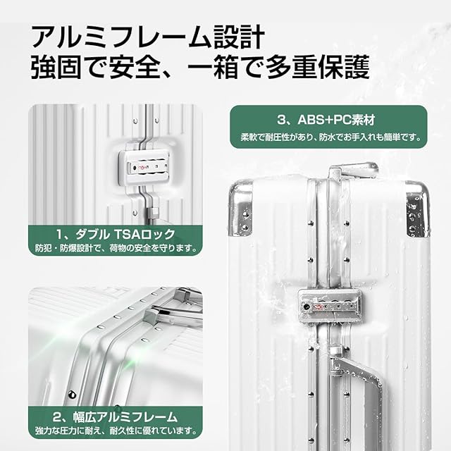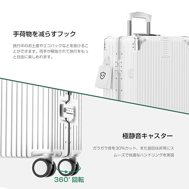 【高品質アルミフレーム&360°静音キャスター】 軽量で割れにくいABS樹脂と耐衝撃性に優れたPC樹脂の複合素材を採用した頑丈なハードケースで、雨天時の移動も安心。特殊消音素材を使用したキャスターは通常より約30%騒音を低減し、360°スムーズに回転。混雑した空港や駅構内でも楽に移動でき、ビジネス出張での乗り継ぎや家族旅行の荷物運びに最適です。静かで快適な移動を実現します。