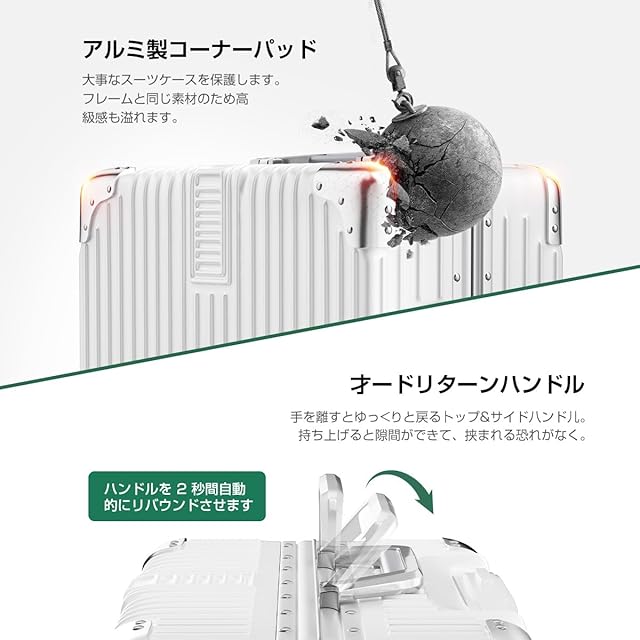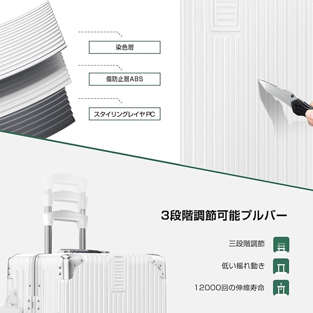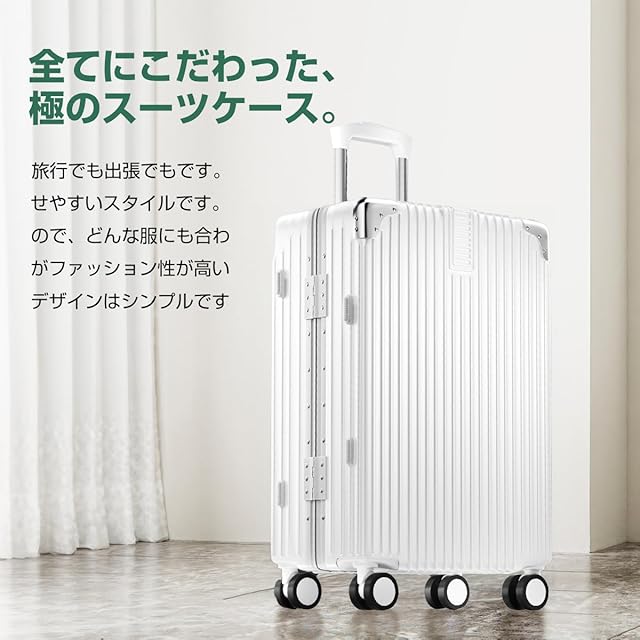 【洗練されたエレガントなホワイトデザイン】このスーツケースは純粋で上品なクラシックなホワイトデザインを採用し、比類のない洗練された質感を表現しています。光沢仕上げのPC素材のボディは繊細な触り心地で、ホワイトカラーは清潔で気品ある雰囲気を醸し出しています。シンプルで精巧なフォルムデザインは、ビジネス出張から週末のリゾートまで、あらゆるシーンに完璧にマッチします。メタルアクセサリーとホワイトボディが見事に調和し、細部まで行き届いた職人技がデザインコンセプトのこだわりを表現しています。
