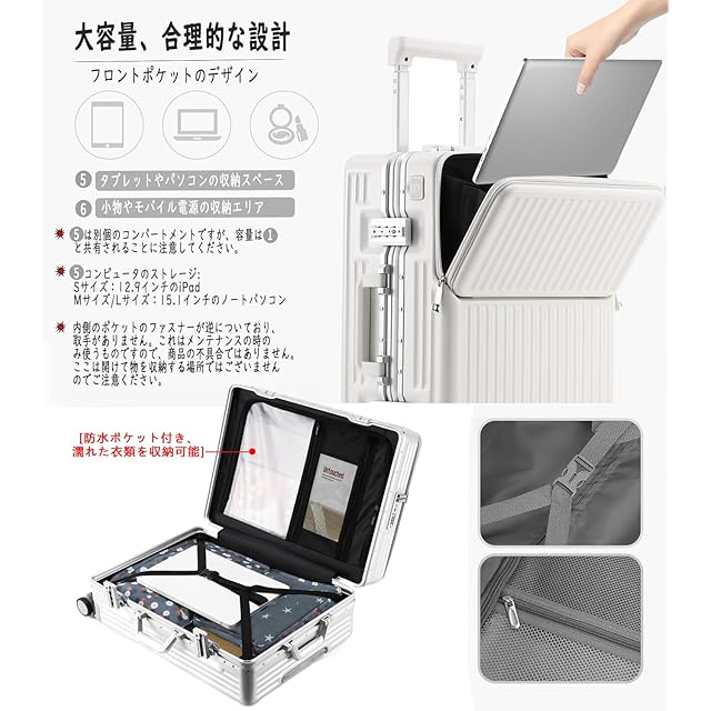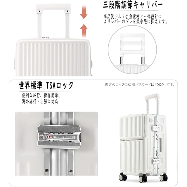商品名:[lanbao] アルミフレームスーツケース 多機能フロントオープン キャリーケース ストッパー付き 機内持ち込み キャリーバッグ 携帯スタンド USBポート付き カップホルダー付き 隠しフック機能 超軽量 耐衝撃 静音 360度回転 ダブルキャスター アルミフレーム ピュアPC材質 大容量 TSAロック搭載 (ワイト, Lサイズ /97L (7泊~長期旅行))