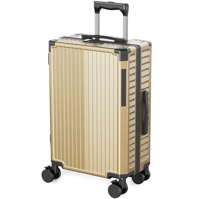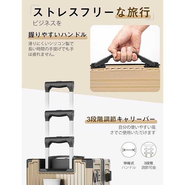 [Soralifer] スーツケース 機内持ち込み キャリーケース キャリーバッグ ストッパー付き静音キャスター USBポート付き ドリンクホルダー付き 物掛けフック 多機能スーツケース 軽量 静音 ファスナータイプ 旅行 ビジネス 出張 (ゴールド, Sサイズ(1-3泊))