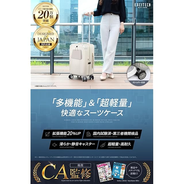 [EXCITECH Biz] 【現役客室乗務員監修】スーツケース キャリーケース 機内持ち込み可能 拡張機能付き ストッパー付き 超軽量【日本企業企画】Sサイズ 40L キャリーバッグ 旅行 ビジネス 出張 1〜3泊 アイボリー