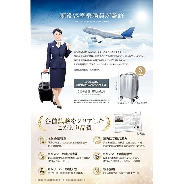【 現役客室乗務員 × 日本企業 】現役客室乗務員の経験を生かし細部までこだわった機能性。使いやすさと軽量で丈夫なところがポイントです。また、国内品質検査にて厳しい試験も実施済みなので安心してお使いいただけます。 旅行やビジネスなど様々なシーンでお使いいただけるデザインのキャリーケース。 【機内持ち込み可能/超軽量】機内持ち込み可能なサイズは、キャスター・ハンドルを含む3辺の合計が115cm以内です。※100席未満の飛行機やLCCの場合は規定サイズが異なるため、各航空会社にご確認ください。 本製品のSサイズは【高さ:約55cm 横:37.5cm 厚み:22.5cm(キャスター・ハンドルを含む)】です。 (Sサイズ容量)約27.6L →(拡張後)約40L(重量)約 2.98kg
