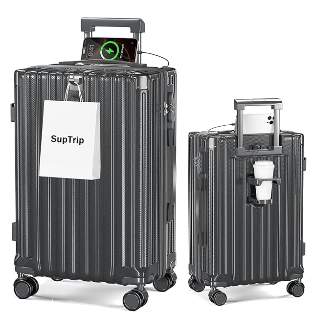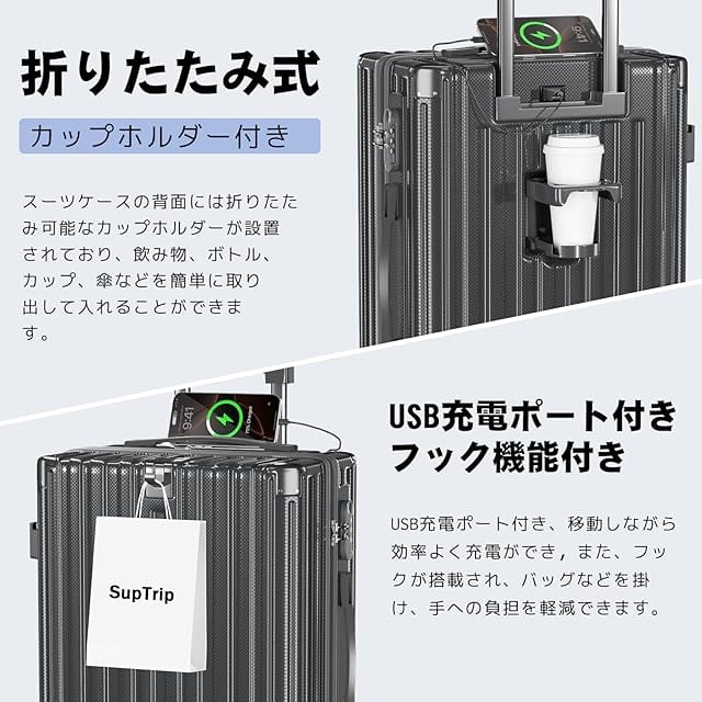 [SupTrip] スーツケース 機内持ち込み 多機能 キャリーケース 大型 超軽量 キャリーバッグ 耐衝撃 USBポート付き カップホルダー付き 充電機能 荷物フック 隠しフック機能 静音 ダブルキャスター 360度回転 修学 泊まる 旅行 出張 (グレー, XL (78L/7-10泊))