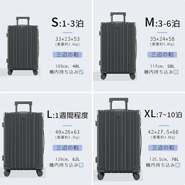 【サイズ】Sサイズ(機内持ち込みOK): 33×23×53cm(重量約2.6kg)、容量約40L(1~3泊対応);Mサイズ:35×24×58cm(重量約2.8kg)、容量約50L(3~6泊対応);Lサイズ:40×26×63cm(重量約3.2kg)、容量約62L(1週間程度);XLサイズ:42×27.5×66cm(重量約3.8kg)、容量約78L(7~10泊対応)※サイズ測定には多少の誤差がありご了承ください。