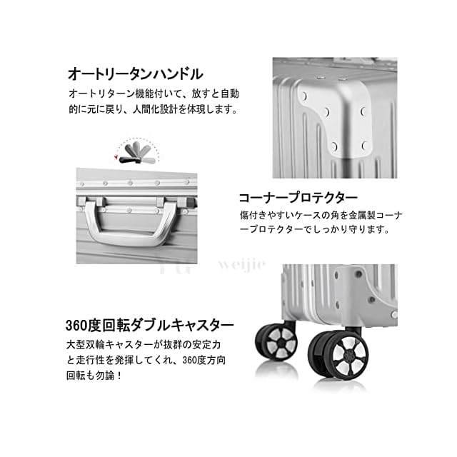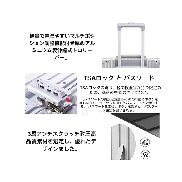【素材】1,表面素材には三層構造のPCポリカーボネート樹脂+ABS素材を採用しており、軽量なのに耐衝撃性に優れています。人気のアルミフレームを採用しており、ビジネスでもカジュアルでもシーンを選ばずに使用できます。スタイリッシュでありながら、と国内旅行や出張には十分な大きさです。 2,フレーム:アルミ。軽量で持ち運びやすいです。女性でも男性でも持てるカラーとデザイン。