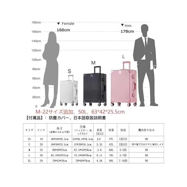 【サイズ】SSサイズの外寸は55*36.5*20.5c,容量は35リットル,三辺の和<115cmです。機内持込が可能であり、新幹線やバスや航空機の客室にでも適用な設計です。Sサイズ容量は42リットル、2~3泊に似合います。Sサイズは軽くて使い勝手の良い機内持ち込みできる、一部の航空会社だけに適用しますので、事前に航空会社に確認したほうがいいんです。M-22inch サイズの容量は50リットル、3-4泊宿泊。M-24inchサイズの容量は60リットル、4-5泊。Lサイズの容量は80リットル、6-7泊, XLサイズの容量は100リットル、7-10泊。旅行や出張などに合わせて最適なサイズを選びます。(サイズにはキャスター、サイド取っ手、ロック、サイドフックが含まれます。)※サイズ測定には多少の誤差がありご了承ください。