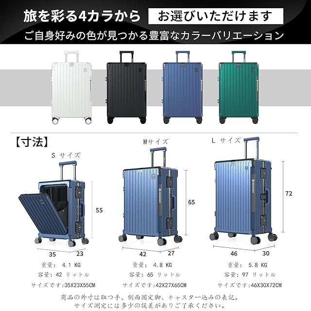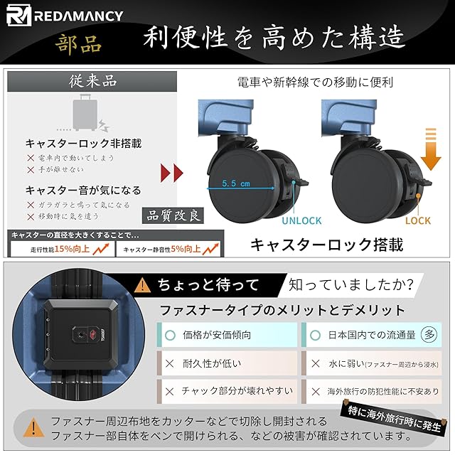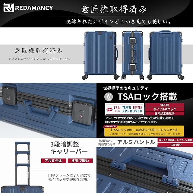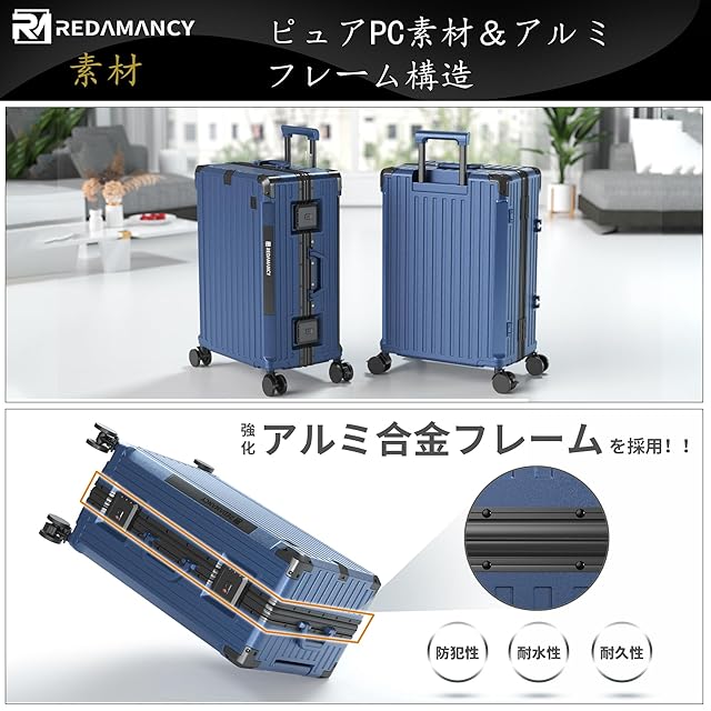 【軽量で耐久性のPC素材 & 包角保護 & アルミフレーム】高品質ポリカーボネート(PC)素材:軽量でありながら非常に丈夫な構造を実現。衝撃に強く、長期的な使用でも変形しにくいので、安心してお使いいただけます。包角保護:には強化された包角保護が施されているため、落下時の衝撃からスーツケースを守り、外観も美しく保てます。アルミニウムフレーム:アルミニウム製のフレームを採用し、全体的な強度を向上させ、耐久性を高めています。この特徴の組み合わせにより、このスーツケースは市場平均より30%耐久性が高くなっている!Redamancyは、お客様の満足度を最優先に考え、最高品質の製品をお届けします。万が一問題があった場合は、迅速に対応いたします。