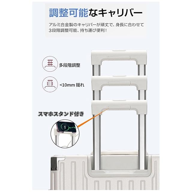 【多機能デザイン】隠しフック・カップホルダー・携帯電話ホルダー付き、旅行中の手元の負担を軽減することができます。男女問わず、ビジネスでの出張でもカジュアルなご旅行でもシーンを選ばずに使用できるデザインです。スーツケース正面に、ハンドバッグやお土産袋をかけられる隠しフックがついています。フック上部を手前に引いてご使用ください。