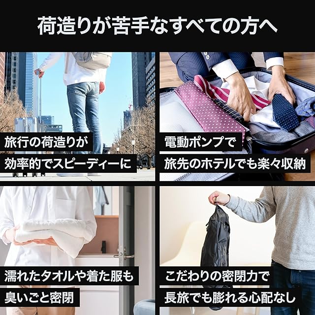 ✅【電動ポンプなら約10秒で圧縮】圧縮トラベルバッグは付属の電動ポンプを使うと約10秒で高速圧縮できます。パワフルなのにコンパクトなので持ち運びにも便利です。3秒間長押しでロックをかけられるのでカバンの中での誤作動を防げます。