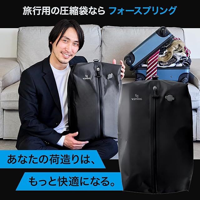 【公式】 4 SPRING (フォースプリング) 旅行 出張に便利 圧縮袋 【かる旅圧縮バッグ】 圧縮 トラベルバッグ 旅行用 (スーツケース収納 便利グッズ) 大容量 トラベル 衣類収納 機内持ち込み 防水/防臭/防塵 [2袋 (ポンプ付き)]