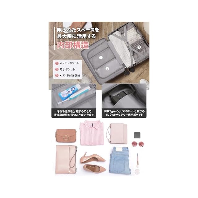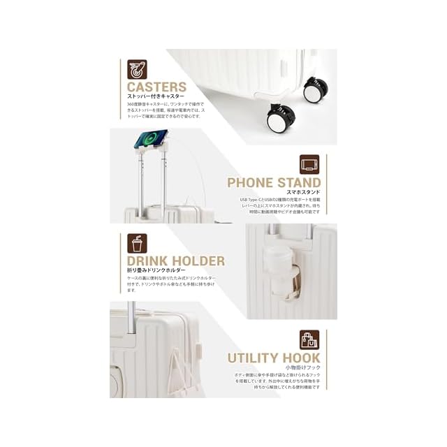 【スーツケース 機内持ち込み・多機能 キャリーケース】①USB充電ポート付き:便利なUSB充電ポート付き、場所を選ばずいつでもどこでも移動しながら効率よく充電ができます。②折りたたみ式カップホルダー付き :便利な折りたたみ式ドリンクホルダー付き。バックカップホルダー、ミルクティーカップ、傘いつでも配置でき、旅行をより便利にすることができます。③隠しフック機能:隠しフックが搭載されており、バッグなどを掛けて、旅行中の手への負担を軽減します。