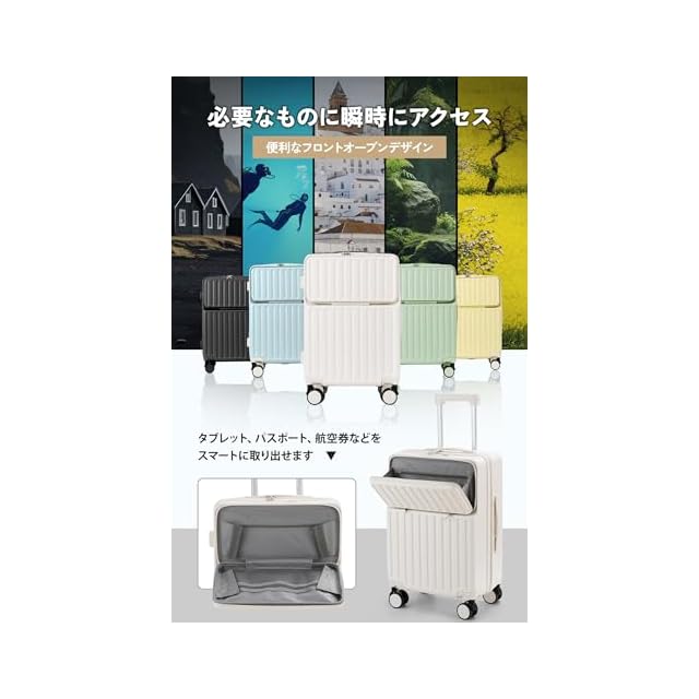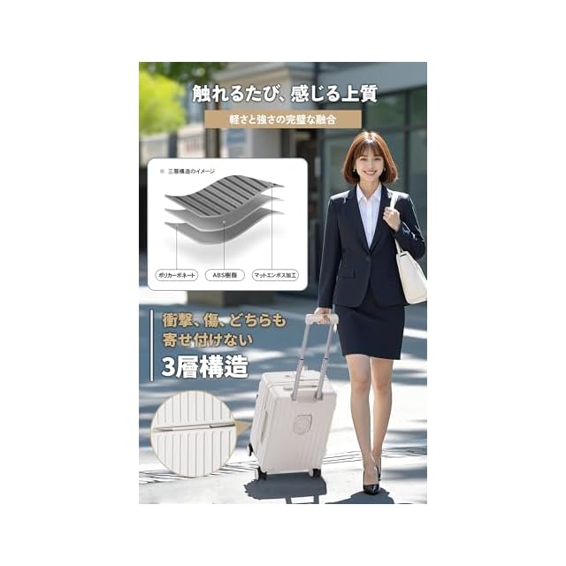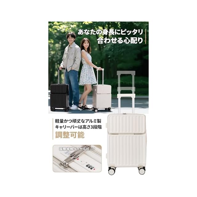 スーツケース 機内持ち込み・多段調節キャリバー・柔軟ハンドル】フロントオープン スーツケースはABS樹脂とPC混合素材を採用されており、軽量で耐圧性、耐久性に優れ、大切なお荷物をしっかりと守ってくれます。三段階調節なスムーズに伸縮でき、さまざまな体格の方に合わせて調整可能です。長旅や出張にも最適です。