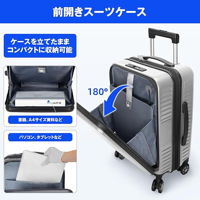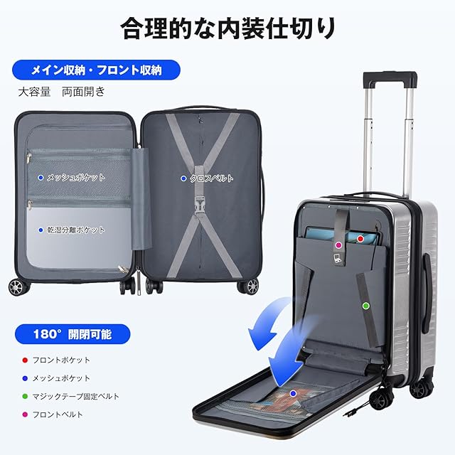 【便利なフロントオープン設計】スーツケースは便利なフロントオープンポケットを搭載し、パソコンやタブレット、パスポートなどの荷物を立てたまま簡単に取り出すことができます。便利なUSB充電ポート付きで、場所を選ばずいつでもどこでも移動しながら効率よく充電ができ、より快適な旅行を楽しめます。