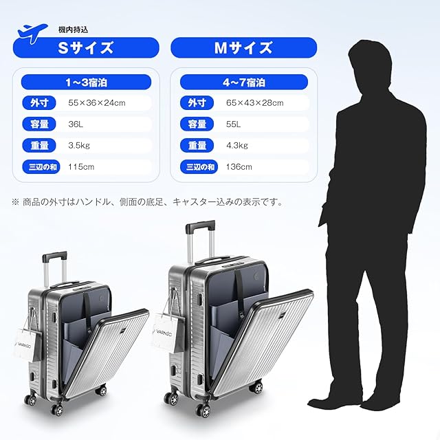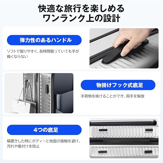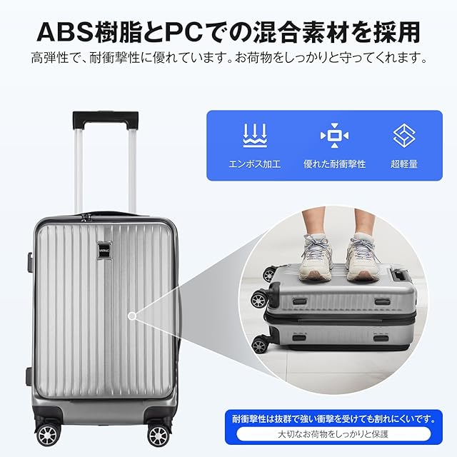 【高品質素材採用】フロントオープン スーツケースはABS樹脂とPC混合素材を採用されており、軽量で耐圧性、耐久性に優れ、大切なお荷物をしっかりと守ってくれます。三段階調節なアルミ合金制キャリーバーはスムーズに伸縮でき、さまざまな体格の方に合わせて調整可能です。長旅や出張にも最適です。