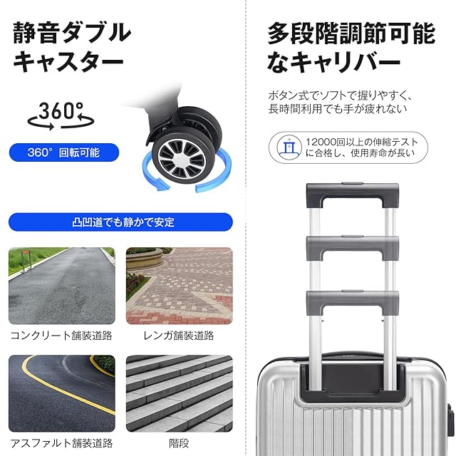 【多機能で実用的なキャリーケース】360°自由に回転可能な静音キャスターは静かで耐摩耗性を大幅に向上し、デコボコ道でもスムーズな滑りを実現します。世界基準のTSAダイヤル式ロック付きでセキュリティも万全。※鍵穴が航空会社の検査専用の物で本製品は鍵が付属しておりません。物掛けフック式底足付きで手荷物を掛けて気楽に移動でき、旅行中の手への負担を軽減します。
