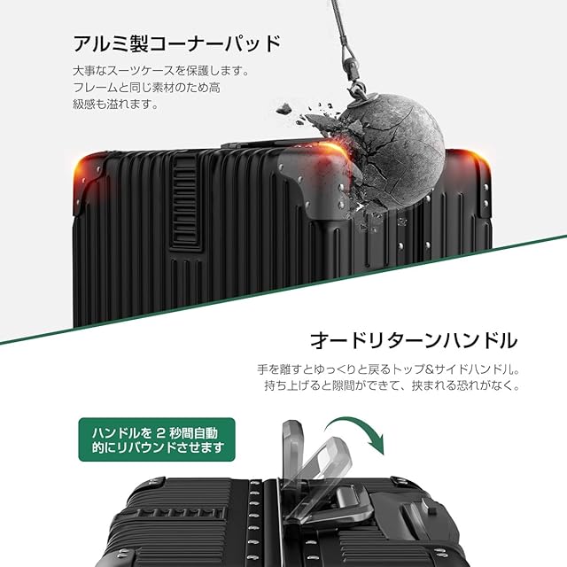 【クラシックでエレガントなブラックデザイン】 このスーツケースは、控えめで上品なクラシックブラックのデザインを採用しており、他にはないラグジュアリーな雰囲気を漂わせます。マット加工されたPC素材のボディは手触りが滑らかで、ブラックの外観は落ち着きがありつつも、繊細でエレガントな印象を与えます。シンプルで洗練されたフォルムは、ビジネス出張はもちろん、週末のリゾート旅行にもぴったりマッチします。金属パーツとブラックのボディが美しく調和し、細部にまでこだわった職人技が光る仕上がりです。