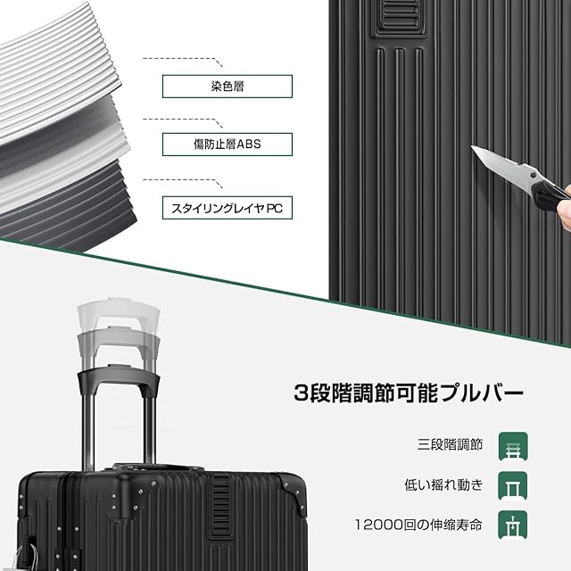 【高品質アルミフレーム&360°静音キャスター】 軽量で割れにくいABS樹脂と耐衝撃性に優れたPC樹脂の複合素材を採用した頑丈なハードケースで、雨天時の移動も安心。特殊消音素材を使用したキャスターは通常より約30%騒音を低減し、360°スムーズに回転。混雑した空港や駅構内でも楽に移動でき、ビジネス出張での乗り継ぎや家族旅行の荷物運びに最適です。静かで快適な移動を実現します。