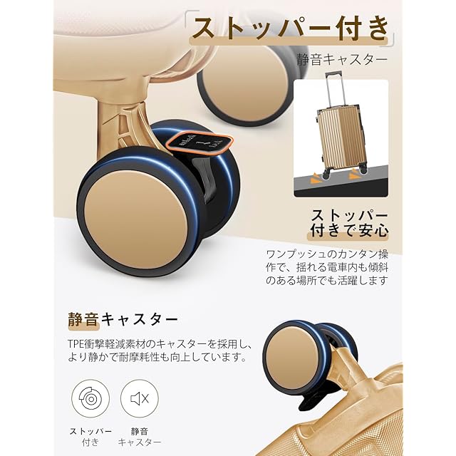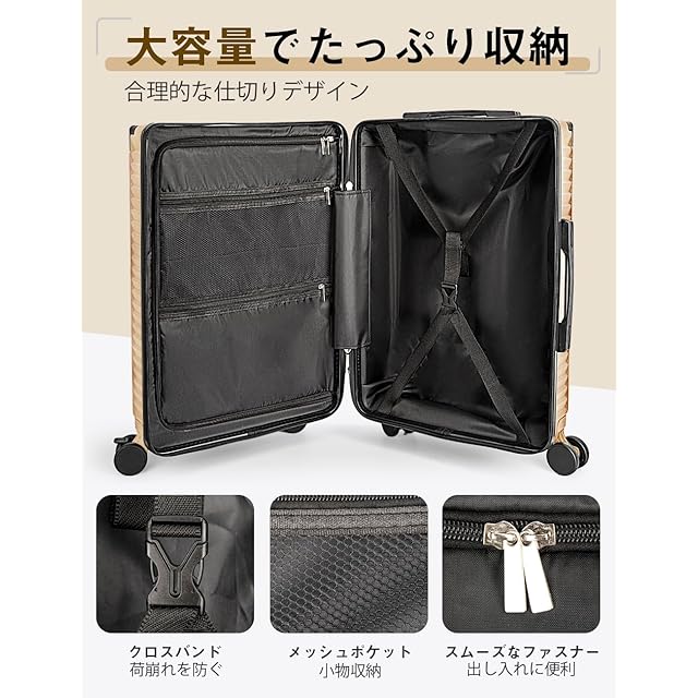 [Soralifer] スーツケース 機内持ち込み キャリーケース キャリーバッグ ストッパー付き静音キャスター USBポート付き ドリンクホルダー付き 物掛けフック 多機能スーツケース 軽量 静音 ファスナータイプ 旅行 ビジネス 出張 (ゴールド, Mサイズ(3-4泊))