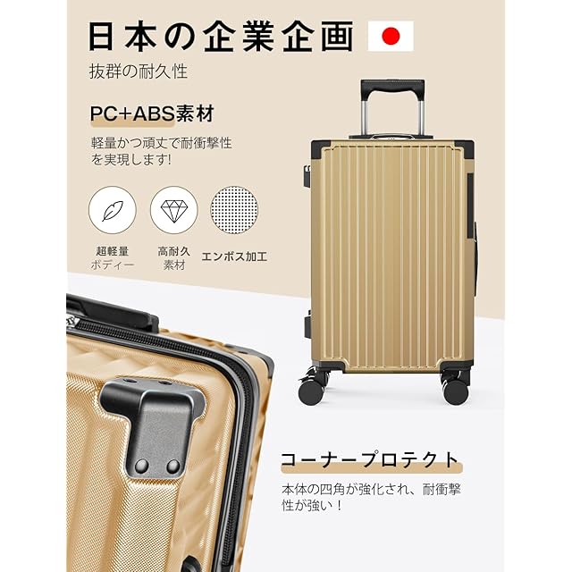 【耐久性抜群・耐衝撃コーナープロテクト】このスーツケースは、ABS 樹脂と PC(ポリカーボネート)混合素材を使用して製造されています。三層構造の素材は、重量を軽減しつつも、強力な耐久性を提供し、旅行中のさまざまな衝撃から荷物をしっかりと保護します。さらに、キャリーケースの四隅には耐衝撃コーナープロテクトが装備されており、ケース全体の耐久性を向上させ、衝撃からしっかりと守ります。