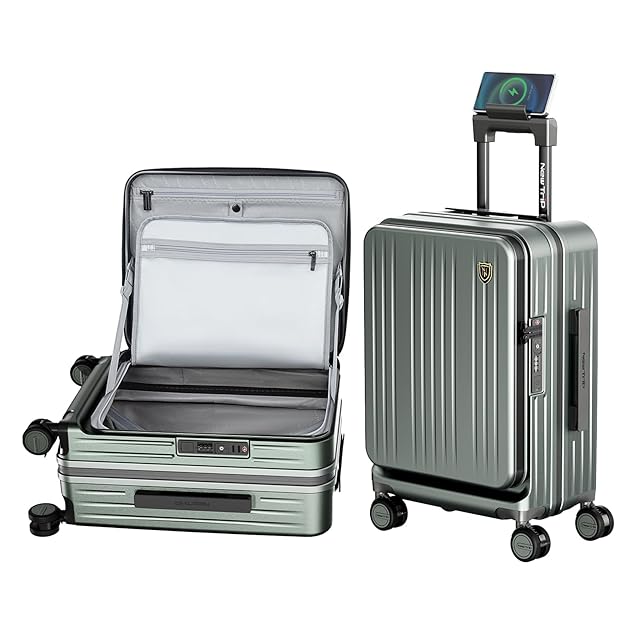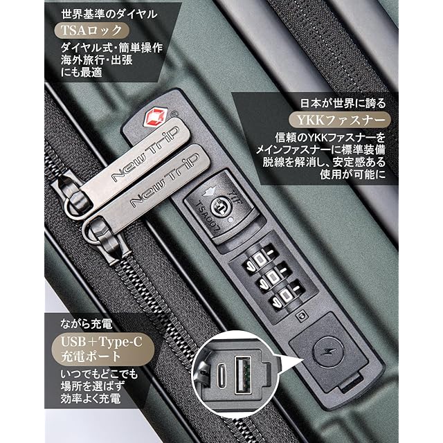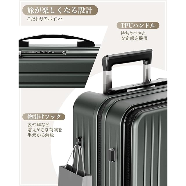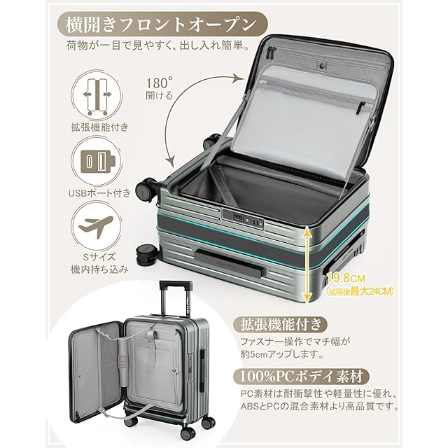 [New Trip] スーツケース キャリーケース フロントオーポン 片開き PC100% 拡張機能付き 機内持ち込み キャリーバッグ USBポート付き ストッパー付き スマホスタンド 隠しフック 軽量 大型 S/M/Lサイズ 耐衝撃 ファスナータイプ 静音ダブルキャスター TSAロック 海外 旅行 ビジネス 出張 (ミッドナイトグリーン、Sサイズ/機内持ち込み/1~3泊)