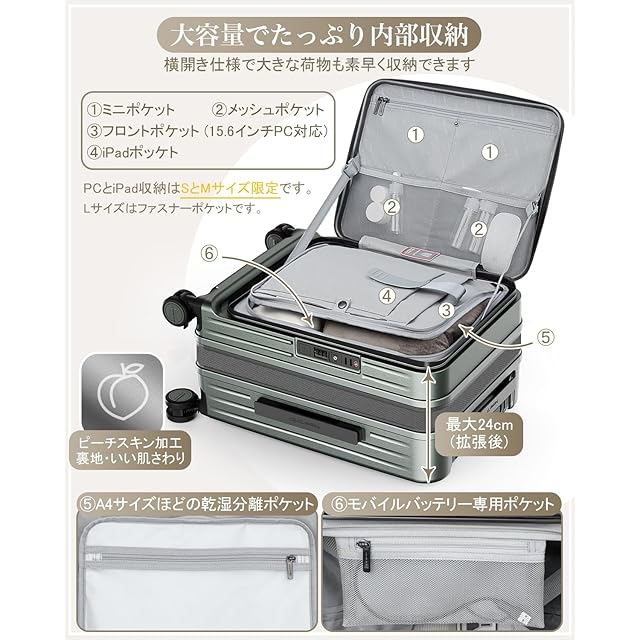 【横開きフロントオープン&容量拡張機能】革新的なフラットトップ開閉で、狭いスペースでもスムーズに荷物を出し入れ可能。大容量の収納スペースが1つあり、深い奥行きにより、かさばるお土産や厚手の服、靴などもすっきり収納できます。さらに、スーツケースの拡張ジッパーを開けるだけで、マチ幅が5cm広がり、容量が20%増加。必要なときにすぐにスペースを拡張でき、旅行の柔軟性を高め、効率的に荷物を収納できる。