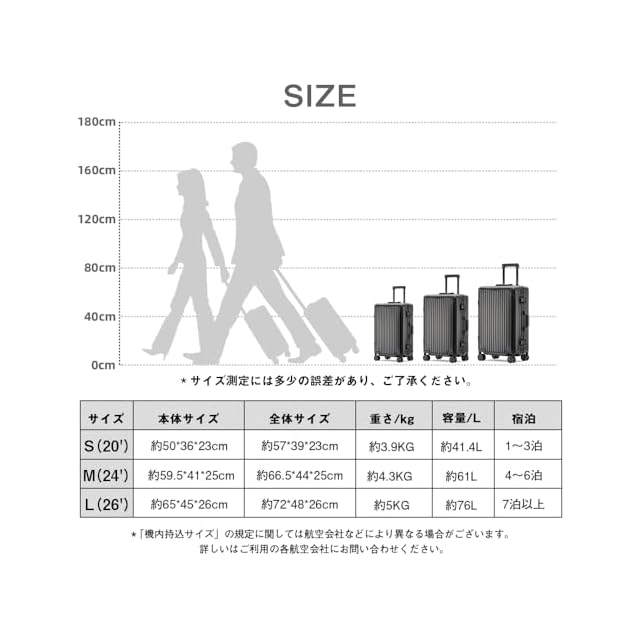 【3つのサイズ】Sサイズの内寸は50*36*23cm、容量は41.4リットル、1~3泊に似合います。Sサイズは一部の航空会社だけに適用しますので、事前に航空会社に確認したほうがいいんです。Mサイズの内寸は59.5*41*25cm、容量は61リットル、4~6泊。Lサイズの内寸は65*45*26cm、容量は76リットル、7泊以上。このサイズは手で図るので、少し誤差があるかもしれません。