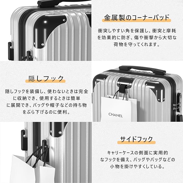 【360°静音キャスター&隠しフック設計】 高弾性TPE緩衝材を用いた滑車は、より静かで耐摩耗性も向上した。安定した滑りを実現するとともに、360度自由回転の機能を備えている。また、スーツケースの前面と側面には隠しフックが装備されており、軽く引くだけでバッグや手提げ袋などを掛け、さらに両手を解放することができます。