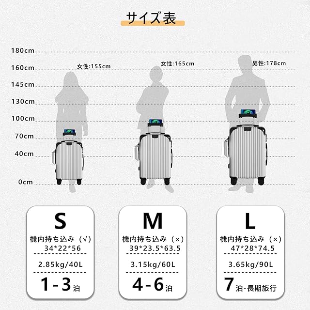【サイズ情報】Sサイズ:34×22×56 cm、三辺合計:112 cm、機内持ち込み可。容量:40 L、宿泊基準:1-3泊。Mサイズ:39×23.5×63.5 cm。容量:60 L、宿泊基準:4 ~ 6泊。Lサイズ:47×28×74.5 cm。容量:90 L、宿泊基準:7泊~長期旅行。※商品の外寸は、トップとサイドハンドル、サイド固定脚、キャスターのマークを取る。寸法測定には若干の誤差がありますのでご了承ください。