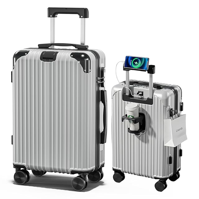 [SupTrip] スーツケース 機内持ち込み キャリーケース USBポート付き キャリーバッグ カップホルダー付き 隠しフック機能 多機能 大型 超軽量 静音 ダブルキャスター 耐衝撃 360度回転 軽量 ビジネス 修学 泊まる 旅行 出張 (シルバー, Sサイズ/機内持込(1-3泊))