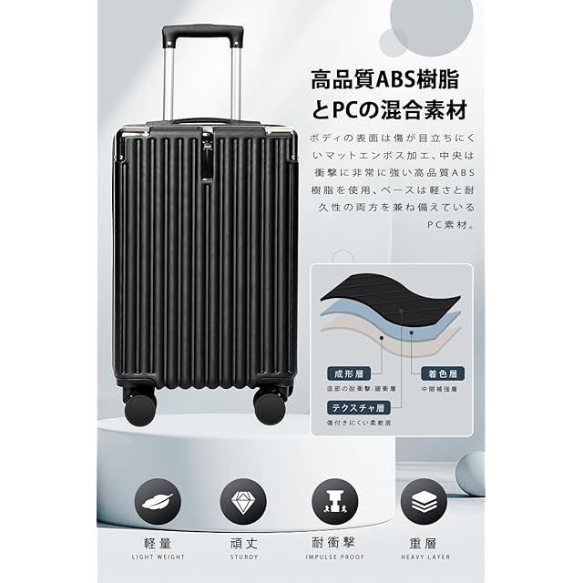 【ABSとPC&耐衝撃】樹脂は耐衝撃性・断熱材に優れる、ABS樹脂は軽くて弾力性と割れに強く、両素材を混合した耐久性が高いハードタイプの高品質ボディを実現しています。スーツケースの容量は38L・外寸35×23×54cm(三辺合計112cm)で機内持ち込み可能です。