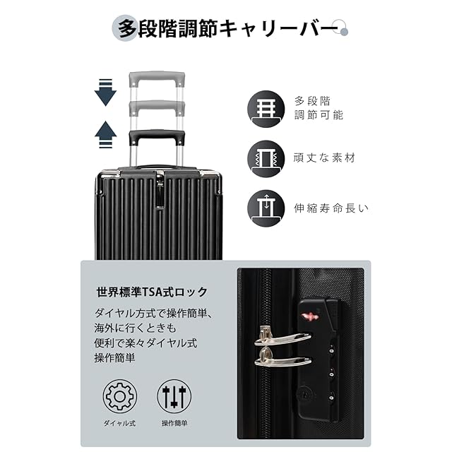 【耐衝撃・静音キャスター・&多段調節キャリバー】金属コーナープロテクト付きで、本体の四角が強化され、耐衝撃性が強い!しっかりと守ってくれます!高弾性TPE衝撃軽減素材のキャスターを採用し、より静かで耐摩耗性も向上しています。スムーズな滑りを実現しながら、360度の自由回転もできます。ボタン一つでキャリーバーの高さを調節できます。キャリーケースは超軽量アルミ製キャリバーを採用、頑丈で揺れ動きにくいです。