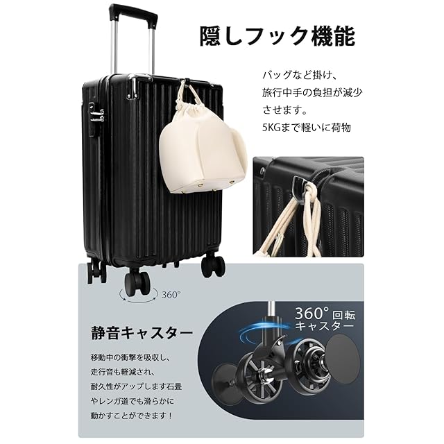 【折りたたみ式カップホルダー付き& 隠しフック機能】キャリーバッグ は折りたたみ式カップホルダー付き :便利な折りたたみ式ドリンクホルダー付き。バックカップホルダー、ミルクティーカップ、傘いつでも配置でき、旅行をより便利にすることができます。隠しフック機能:隠しフックが搭載されており、バッグなどを掛けて、旅行中の手への負担を軽減できます 。