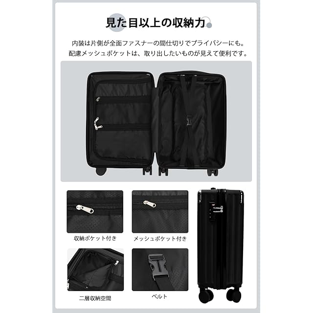 【合理的な仕切りデザイン&安心のTSAロック】密閉されたU字型コンパートメントのおかげで、荷物を入れるとばらばらになりません。メッシュ状のポケットにも付き、入れ物は一目でわかります。後シェルは固定バンド装備して、荷物崩れを防着ます。世界基準のTSAロック搭載。アメリカ空港(グアム、ハワイ、サイパン含む)では必需品。信頼のTSA職員と本人しか開けることができません。、ダイヤル式ロックなので、鍵をなくす心配もありません。