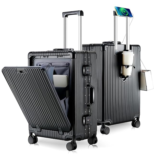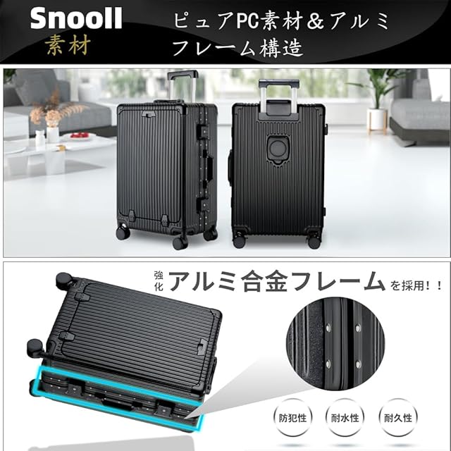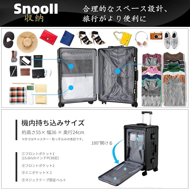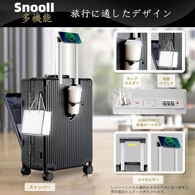 [SnooII] スーツケース 機内持ち込み 多機能フロントオープン キャリーケース ストッパー付き 携帯スタンド USBポート付き カップホルダー付き 隠しフック機能 超軽量 耐衝撃 静音 360度回転 ダブルキャスター アルミフレーム ピュアPC材質 大容量 TSAロック搭載 旅行 ビジネス 出張 (ブラック, Sサイズ /42L /機内持込 (1-3泊))