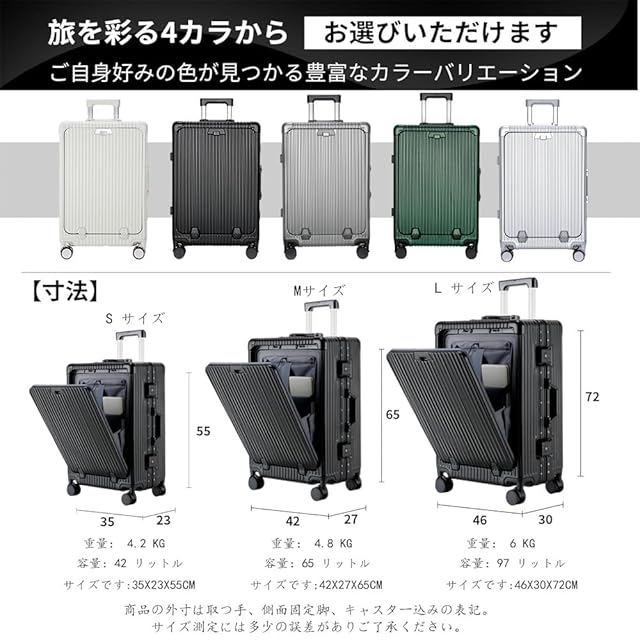 【前開きポケット&USB充電ポート付き&スマホスタンド機能】大きく開き 取り出しやすい!ジッパーを開ける必要がなく、1秒で素早く開く!立てたまま荷物の出し入れができる便利なフロントオープンスーツケースです。13インチ/15.6インチまでパソコンやタブレット、パスポートなど荷物に合わせた細かなポケットがあり、空港や新幹線の中、旅の途中でも、前ポケットから出したいものを簡単に取り出すことができ、子連れの方やビジネスシーンでも活躍しています。便利なUSB充電ポート付き、場所を選ばずいつでもどこでも移動しながら効率よく充電ができます。