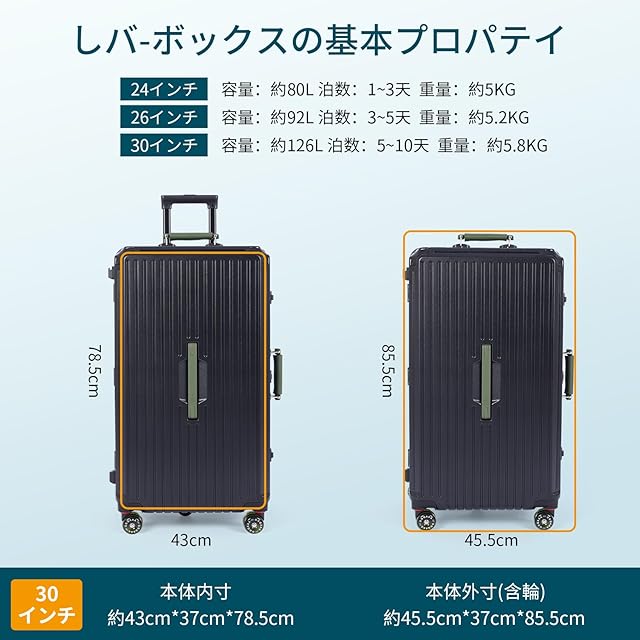 【スーツケースの仕様】キャスターを含めているサイズは以下です、24寸: 41.5cm*34cm*68cm。26寸: 41.5cm*35cm*73.5cm。30寸:45.5cm*37cm*85.5cm。キャスターを含めないサイズは以下です、24寸: 39cm*34cm*62cm,26寸: 39cm*35cm*67cm,30寸:43cm*37cm*78.5cm注意:手作業による測定のため、サイズは1~2cmの誤差がありますので、ご了承ください。