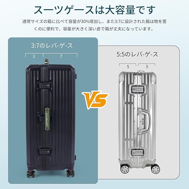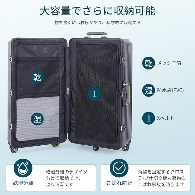 【革新的な3:7の型で スーツケース】収納スペースが、展開すると半分個づつの大きさのキャリーケースと違い、革新的な3:7の型で、深めの半分、ヘルメットや小型炊飯器、靴など、通常のスーツケースには入らない荷物も立てて入れられて、 もう片方に細かいモノを入れたりと、スッキリと収納が出来ます。インナーカバーがありますが、はずせばギリギリまで荷物を詰められます。乾湿分離のデザイン、分けて収納でき、よりきれいです。荷物の出し入れも便利に行えます。