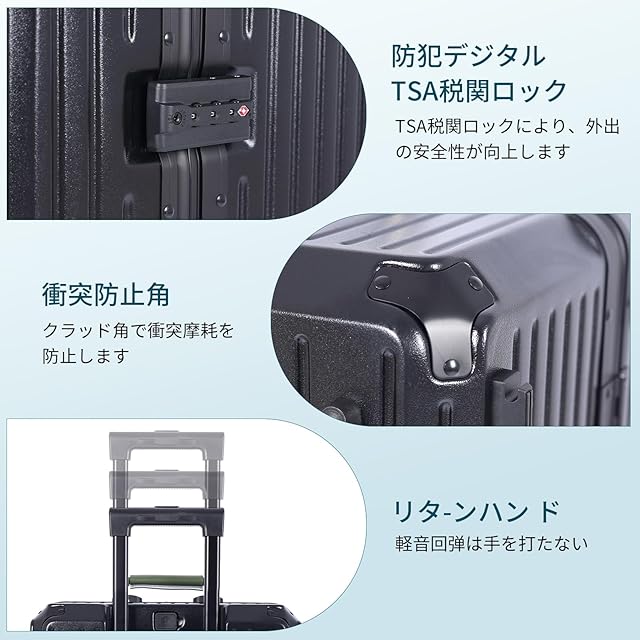 【材質&TSAダイヤル式ロック】スースケースはPC素材を採用し、耐衝撃性に優れた上、高弾性で、変形しにくい。エンボス加工、傷つきにくい。ABS素材より頑丈で耐久性に優れ、アルミフレームスーツケースより軽量で持ち歩きやすい。TSAダイヤル式ロックが搭載されて、外出がより安全。【※注】また、鍵穴は航空会社検査専用の物です。本製品に鍵は付属しておりません。