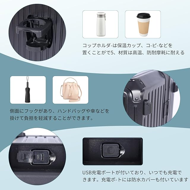 【カップホルダー+サイドフック】スーツケースの背面にカップホルダーがあり、飲み物、傘などの小物を簡単に取り出せる。折りたたみ可能なデザインは外観に影響を与えません。サイドにフックが付いているので、ハンドバッグやギフトバッグなどの荷物を掛けることができ、旅行時の負担を軽減します。