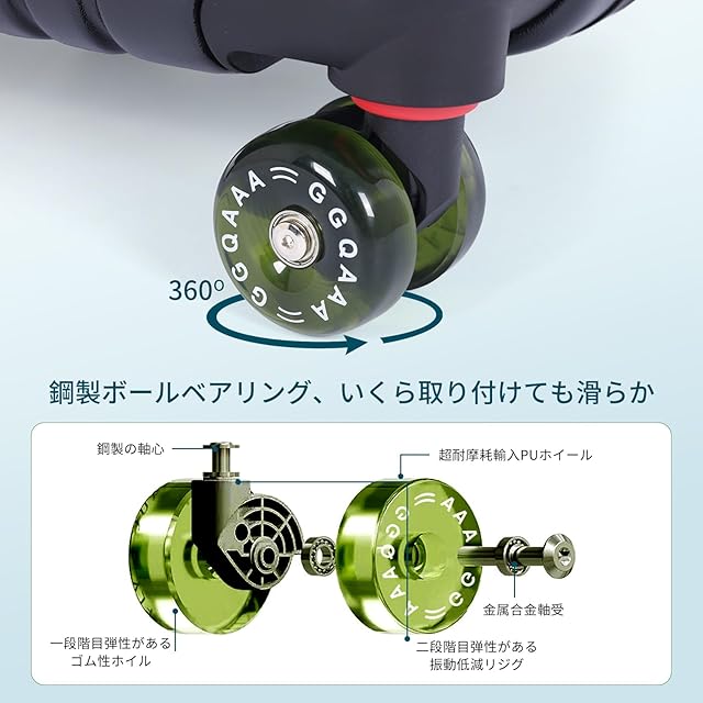 【灌注轮の型スーツケース】革新設計のキャスターシステム、二段階ショック吸収構造:第1段階:高弾性ゴムホイールによる初期衝撃緩和。 第2段階:特殊成型ホイール内蔵のサスペンションスプリングでさらなる振動低減。従来比150%の衝撃吸収性能を実現。プロ仕様の耐久設計, クロカン級ショックアブソーバーベアリング採用,同重量荷物でも30%軽い操作感。