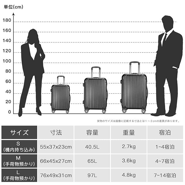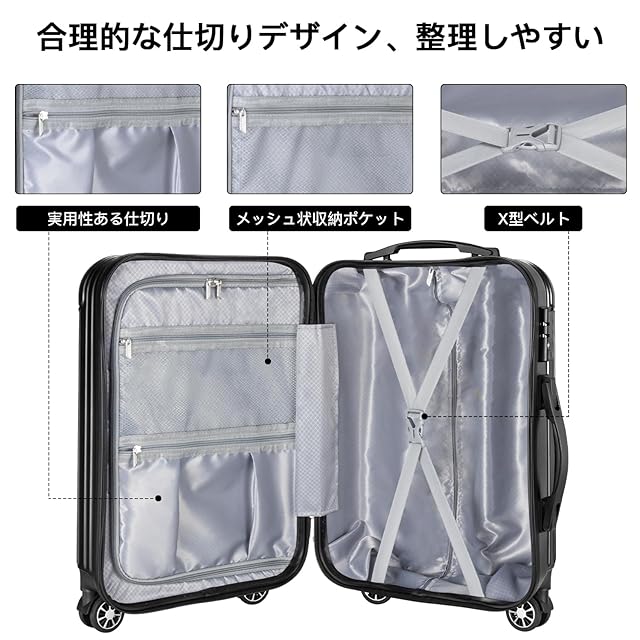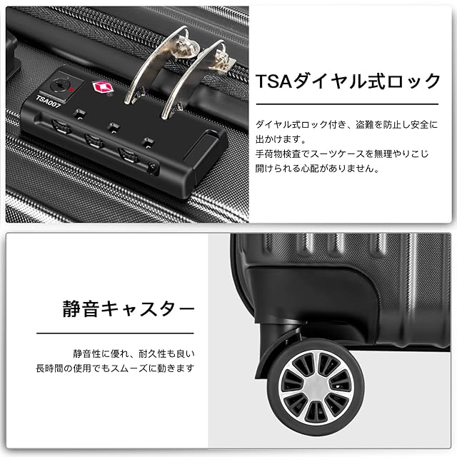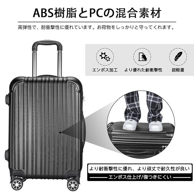 【材質&TSAダイヤル式ロック】スーツケースはABS樹脂とPCでの混合素材で作られ、耐衝撃性に優れた上、高弾性で、変形しにくい。エンボス加工、傷つきにくい。アルミフレームスーツケースより軽量で持ち歩きやすい。TSAダイヤル式ロックが搭載されて、外出がより安全。また、鍵穴は航空会社検査専用の物です。本製品に鍵は付属しておりません。