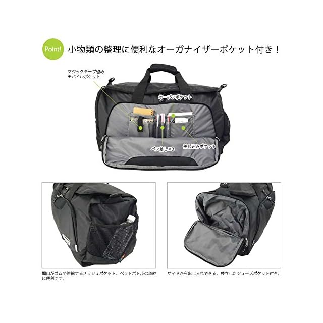 【豊富な収納スペース】メインコンパートメントに加えフロントポケットやサイドポケットが装備されているため、多様な荷物を種類ごとに分けて収納することができます。