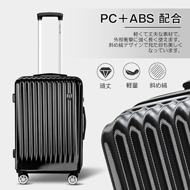 【高品質なボディ&信頼のYKKファスナー】ABS樹脂は軽くて弾力性と割れに強く、PC(ポリカーボネート)樹脂は耐衝撃性・断熱材に優れる、両素材を混合した耐久性が高いハードタイプの高品質ボディを実現しています。また、日本が世界に誇るYKKファスナーをメインファスナーに標準装備。ファスナータイプのスーツケースによくあるファスナーの不具合(ファスナー脱線や開き)を解消し、長期にわたり安定した使用感が可能となりました。
