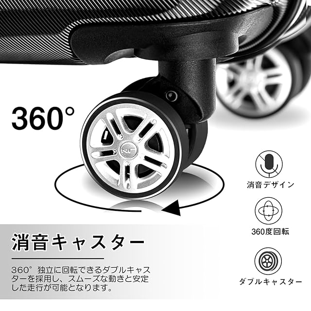 【超静音ダブルキャスター&安心のTSAロック】360度回転可能の8輪ダブルキャスターは、静音と耐久性抜群で、凸凹道でもスムーズに走ることができます。また、世界基準のTSAロック搭載しています。アメリカ空港(グアム・ハワイ・サイパン含む)では必需品です。ダイヤル式ロックなので鍵を無くす心配がないのも魅力です。