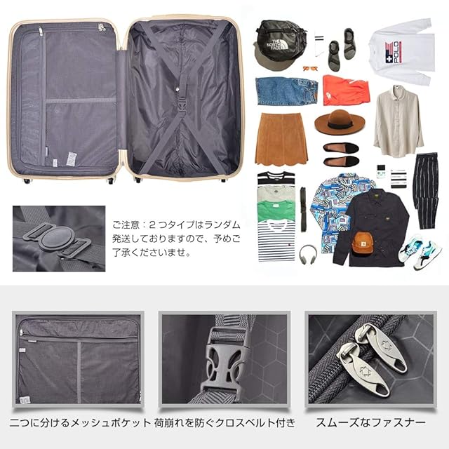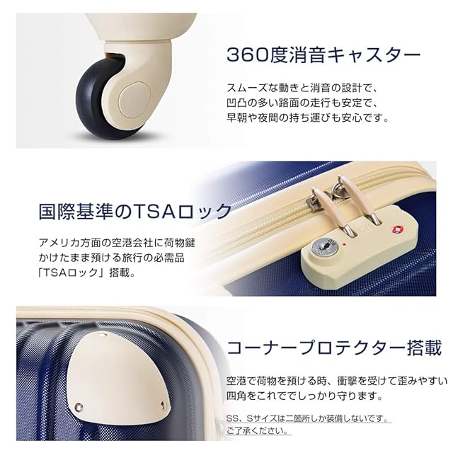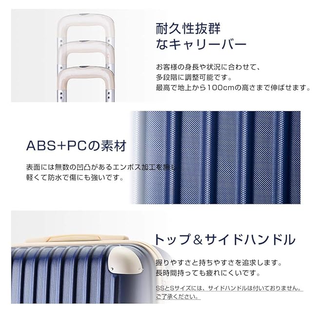 軽量なので重さ制限に有利で、女性の方でも軽々と持ち上げることができます。【TSAロック】海外旅行には欠かせない世界基準のダイヤル方式のTSAロックを採用しています、国内外にも関わらず、航空便をご利用する際に便利で、より安全で便利です。※ご注意:鍵は付いておりません。予めご了承ください。ご注意!!:SS、S、容量UP--SSと容量UP-Sサイズは寸法のため、側面のハンドルと底足が付いていません。そして、コーナープロテクトが二箇所しか装備しないです。