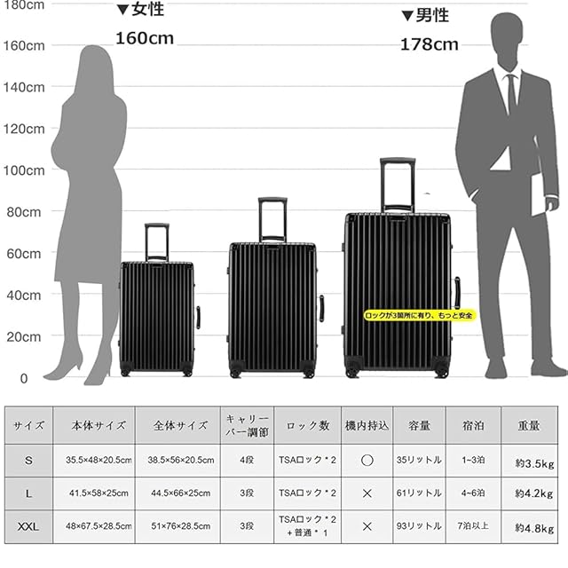 【サイズ】Sサイズの内寸は48*35.5*20.5cm、容量は35リットル、1~3泊に似合います。Sサイズは一部の航空会社だけに適用しますので、事前に航空会社に確認したほうがいいんです。Mサイズの内寸は50*38.5*22.5cm、容量は48リットル、2-4泊以上。Lサイズの内寸は41.5*58*25cm、容量は61リットル、4-6泊以上。XLサイズの内寸は62*45.5*26.5cm、容量は78リットル、5-7泊以上。XXLサイズの内寸は67.5*48*28.5cm、容量は93リットル、7泊以上