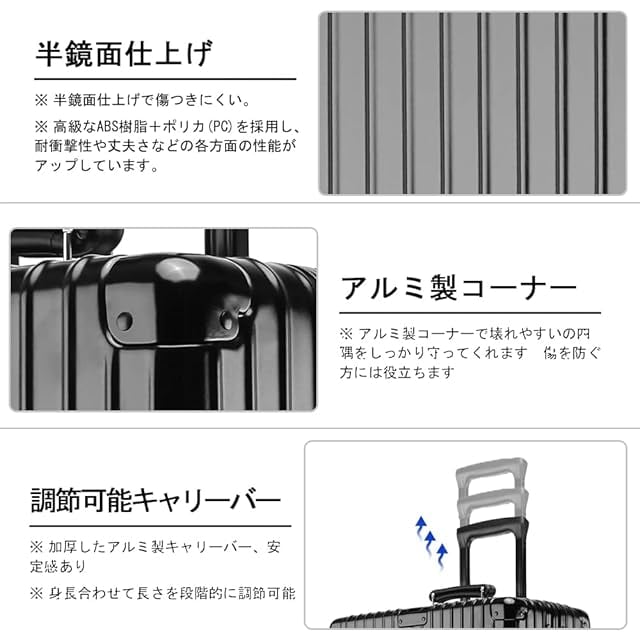 【耐衝撃材质】おしゃれのトランクは高級なABS+PC混合樹脂を採用し、耐衝撃性や丈夫さなどの各方面の性能がアップしています。そしてりょこバッグの表面にはヘアライン仕上げがされましたので、傷を防ぐ方には役立ちます。超軽量ですから海外のトラベルやビジネス出張に便利です。